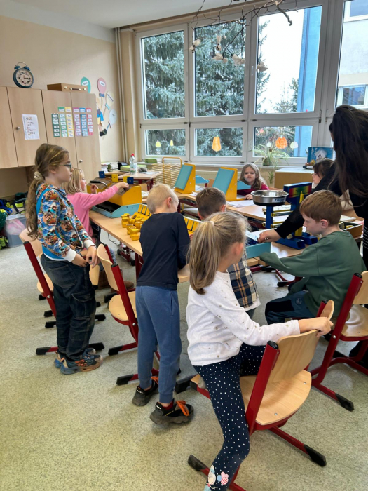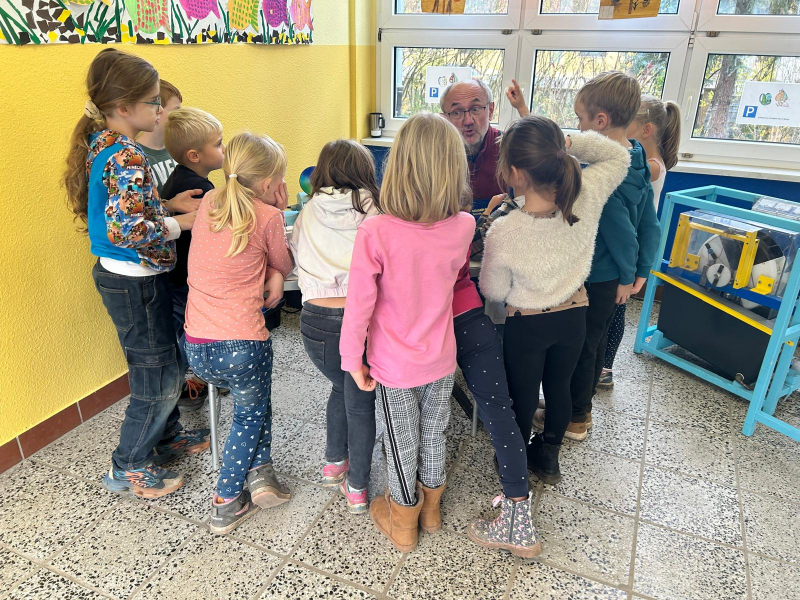 Herr Tiebel, vom Neugierexpress, besuchte uns für einen Projekttag und brachte für insgesamt 8 Stationen mehr als 15 Exponate mit, an denen die Kinder forschen, entdecken, ausprobieren und experimentieren konnten.
